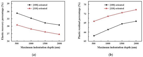 The elastic recovery and the plastic residual percentages versus the maximum indentation depth hmax for the [100]- and [110]-oriented PIN–PMN–PT single crystals are shown in Figure 4. It can be seen that with increasing the hmax, the elastic recovery percentage decreased from 35.21% to 30.49% for the [100]-oriented PIN–PMN–PT crystal and from 30.50% to 26.75% for the [110]-oriented PIN–PMN–PT crystal. At each hmax, the elastic recovery percentage of the [100]-oriented PIN–PMN–PT crystal was larger than that of the [110]-oriented PIN–PMN–PT crystal. Conversely, with increasing the hmax, the plastic residual percentage increased from 64.79% to 69.51% for the [100]-oriented PIN–PMN–PT crystal and from 69.50% to 73.25% for the [110]-oriented PIN–PMN–PT bulk single crystal. At each hmax, the plastic residual percentage of the [100]-oriented PIN–PMN–PT bulk single crystal was less than that of the [110]-oriented PIN–PMN–PT bulk single crystal. This indicated that the higher the maximum indentation depth hmax or peak load, the lower the elastic recovery percentage and the higher the plastic residual percentage in the PIN–PMN–PT bulk single crystals. Under indentation stress, some of the domains of the PIN–PMN–PT bulk single crystals tend to switch, forming non-180 domain walls to minimize elastic energy []. The formation of these non-180 domain walls may cause irreversible depolarization, relieving the internal stress built up in the PIN–PMN–PT bulk single crystals []. This reduces the driving force for the recovery of the PIN–PMN–PT bulk single crystal. Therefore, at the maximum indentation depth of 500 nm to 2000 nm, the plastic deformation is larger than the elastic deformation, and the plastic residual percentage is larger than 50%, which means that the plastic deformation dominated in the indentation process of the PIN–PMN–PT bulk single crystal.