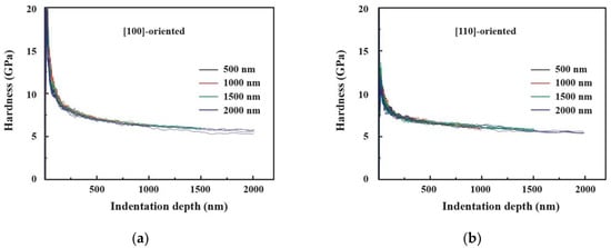 Hardness–indentation depth curves of the (a) [100]- and (b) [110]-oriented PIN–PMN–PT single crystals at the maximum indentation depths from 500 nm to 2000 nm.