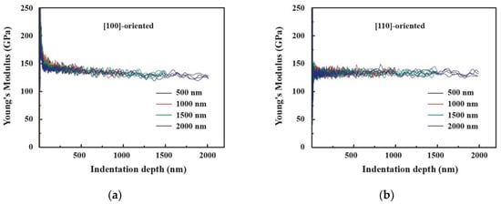 Young’s modulus–indentation depth curves of the (a) [100]- and (b) [110]-oriented PIN–PMN–PT single crystals at the maximum indentation depths from 500 nm to 2000 nm.