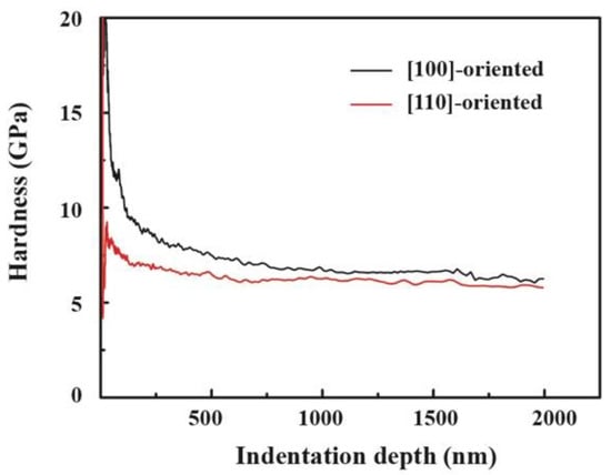 To compare the hardnesses and Young’s moduli of the [100]-and [110]-oriented PIN–PMN–PT bulk single crystals, the hardness and Young’s modulus were determined as the average of the values of four indentations at every indentation depth, with maximum indentation depth of 2000 nm. The corresponding hardness–indentation depth curves and the Young’s modulus–indentation depth curves of the [100]- and [110]-oriented PIN–PMN–PT bulk single crystals are shown in Figure 7 and Figure 8, respectively.