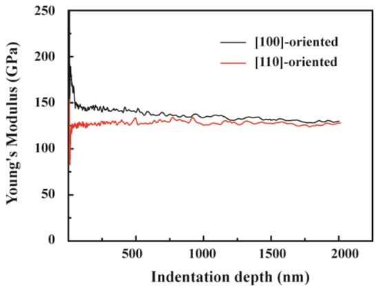 Young’s modulus–indentation depth curves of the [100]- and [110]-oriented PIN–PMN–PT bulk single crystals.