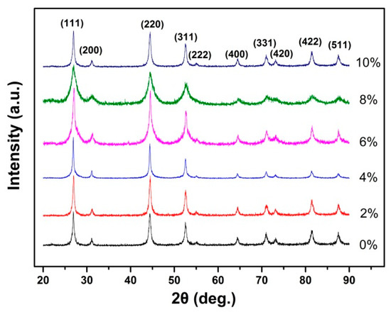 The XRD spectra of SrF2 nanoparticles with different Tb doping concentrations.
