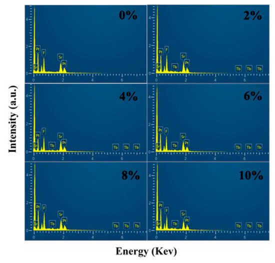 The EDS spectra of SrF2 nanoparticles with different Tb doping concentrations.