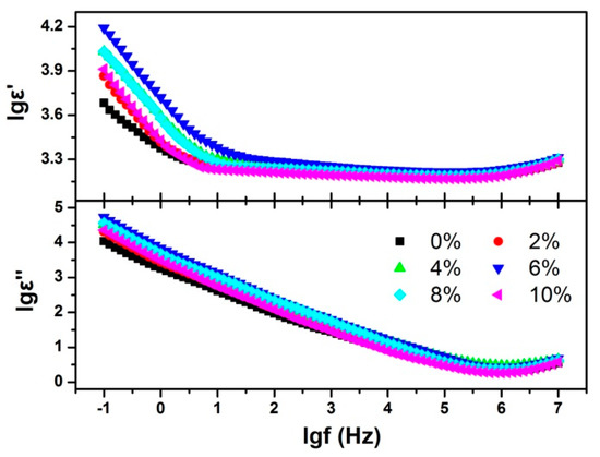 To get a deep understanding about the carrier transport mechanism, the complex permittivity was also investigated. The real part (ε′) and imaginary part (ε″) of permittivity were shown in Figure 6. It can be seen that ε′ decreases sharply with the frequency increasing then decreases flatly and finally increases. ε″ decreases with the frequency increasing and then increases. The strong dispersion of the permittivity in the low frequency indicates that the carrier was hopping in the transport process [25]. From the permittivity results, it can be deduced that the ε′ and ε″ values in the low frequency decrease as the sample resistance increases. With the Tb-doping concentration increasing, the interstitial F− quantity increases and the activation enthalpy decreases, these lead to the increases of the carrier quantity and hopping probability; and finally result in the increases of ε′ and ε″. When the doping concentration is higher than 6%, the defects aggregate into clusters and the interstitial F− quantity involved in the conduction does not increase anymore; the increase of deformation potential scattering causes the carrier hopping more difficult and the decreases of ε′ and ε″.