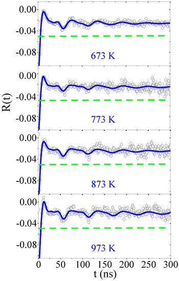 Time-differential perturbed gamma–gamma angular correlations (TDPAC) spectra measured at room temperature (RT) as a function of the annealing temperature for SnO2 powder samples. The continuous blue curves are the fit of theoretical model based on Equation (1) to experimental data represented by the open circles with error bars. The green dashed horizontal lines are guides to the eye for R(t)= −0.05.