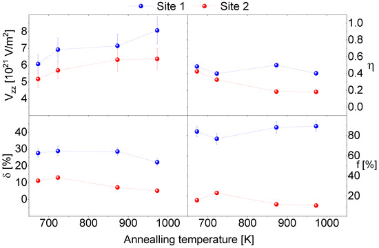 A graphic representation of the corresponding temperature dependence of the hyperfine parameters: the major component of the electric field gradient (EFG) (Vzz), the asymmetry parameter (η), the frequency distribution (δ), and the population of probe nuclei site fraction (f). Dotted lines are a guide for the eyes.