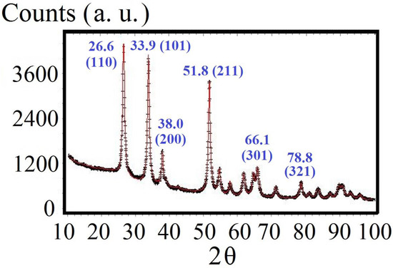The Cd-doped SnO2 powder samples were prepared by using a sol–gel process. The detailed preparation procedure and the TDPAC results of the nanostructured SnO2 powder without doping can be found in our previous work [14]. We emphasize that the addition of 111In and Cd was performed before the gel formation with a 1.4% Cd content. The thermal treatment under a nitrogen atmosphere was performed for 10 h prior to the TDPAC measurements. The system was further characterized at the Laboratório de Caracterização Tecnológica (LCT), University of Sao Paulo, Brazil, after the probe nuclei 111In(111Cd) decayed by using X-ray diffraction (Philips Xpert and Malvern Panalytical Ltd., Kassel, Germany), electron dispersive spectroscopy (EDS) (FEI (Quanta 650FEG), Hillsboro, OR, USA), and scanning electron microscopy (SEM) (FEI (Quanta 650FEG), Hillsboro, OR, USA), for the secondary electrons (SE) mode.