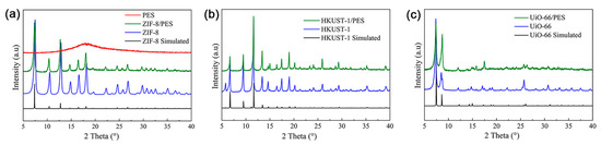 PXRD patterns of MOF, PES and MOF/PES composite materials employing (a) ZIF-8, (b) HKUST-1, and (c) UiO-66.