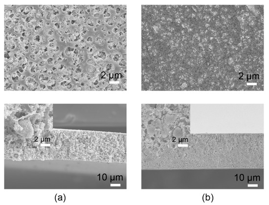 Nanosized ZIF-8/PES composite materials prepared using (a) DMA and (b) NMP as the solvents. Top panels are images of the surface, and lower panels are cross-sectional images. Loading of ZIF-8 was 60 wt.%.