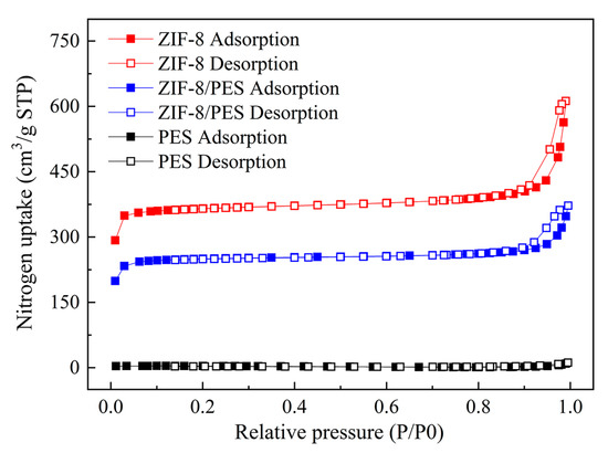 Nitrogen adsorption−desorption isotherms at 77 K for nanosized ZIF-8, PES, and nanosized ZIF-8/PES composites. For composites, the solvent was DMF, and the ZIF-8 loading was 60 wt.%.