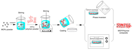 MOF/PES composite synthesis. MOF powder (0.21–1.17 g corresponding to 30–70 wt.% loading of MOF in composites) was suspended in 5 mL of solvent (DMF, NMP or DMA) for 24 h via mechanical stirring at room temperature. PES particles (0.5 g) were then gradually added to the MOF solution under stirring. The MOF-polymer solution was stirred for another 24 h at 333 K, and the prepared mixed solution was then poured into a Petri dish for casting. After that, two separate methods were used to obtain the final composite. One method is phase inversion based on solvent exchange. In this method, a nonsolvent liquid (deionized water:ethanol = 50 mL:50 mL) was used for exchange and was poured into a Petri dish at room temperature for precipitation. The products were then repeatedly washed with refreshed non-solvent to remove the remaining solvent. Finally, the composites were dried in air at room temperature. The other method is the solvent evaporation technique. In this method, a Petri dish is placed in an oven at 363 K and left uncovered over night to allow the evaporation of the solvent. The layers were then peeled off of the Petri dishes, and finally, the products were treated overnight in an oven at 353 K and then in a vacuum oven at 393 K for another 12 h to completely remove the remaining solvent. The whole synthesis process is shown in Scheme 1.
