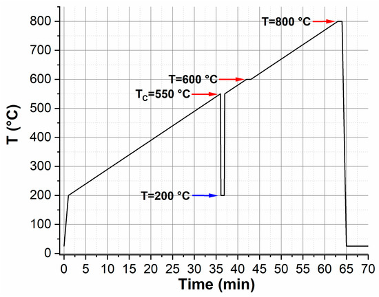 In order to determine their shape and size distribution, the particles were drop casted after dispersion in ethanol which was then let to evaporate on a copper TEM grid covered with a thin amorphous carbon film acting as mechanical support (TedPella, Redding, CA, USA). Transmission electron microscopy (TEM) bright field (BF) imaging of the starting material was performed by using a FEI Tecnai Microscope (Eindhoven, The Netherlands) operating at an acceleration voltage of 120 kV, equipped with a thermionic LaB6 electron source, an objective twin lens and a Gatan (Pleasanton, CA, USA) Orius CCD Camera. The in situ TEM was performed by using a FEI Titan Microscope (Eindhoven, The Netherlands) operating at an acceleration voltage of 300 kV, equipped with an ultra-bright Schottky (X-FEG) electron source, a cryo-twin objective lens, and a Gatan 4k × 4k CCD Camera. The in situ TEM experiment was performed by using a MEMS (microelectromechanical system)-based ultra-low drift heating holder from DensSolution (Delft, The Netherlands), which mounts MEMS chips commercially provided by the same producer, and made by a silicon nitride film with a heating and a thermo-resistive-based spiral. Elliptical, thin, electron-transparent windows were fabricated between the two spirals and were used as regions of interest where the deposited particles could be heated and imaged. This kind of heating MEMS chip has a thermal accuracy higher than 0.1 °C; a lateral drift lower than 5 nm both after a rapid thermal increase of several hundreds of degrees and at constant temperature, the latter intended per hour of experiment; and a maximum heating temperature of 1200 °C. Before performing the in situ heating experiment, the sole sample holder (with no MEMS-based heating chip inserted) was cleaned for 15 min by a Gatan Solarus plasma cleaner, using a mix of O2 and H2 and with a power of 50 W. Then, a MEMS-based heating chip was inserted in the sample holder, and before the deposition of the sample, it was again plasma cleaned for further 2 min, with the same gas mix at a power of 20 W. The crystallization of the sample was monitored while heating the MEMS under selected area electron diffraction (SAED) geometry, after choosing and following a group of few tens of particles and imaging their electron diffraction pattern (EDP). In order to minimize the loss of focus due to the thermal bulging of the MEMS during heating, the starting temperature was chosen to be equal to 200 °C, where the z-height of the sample was adjusted keeping it in eucentric focus conditions. Then, the sample was first heated with a thermal ramp of 10 °C min−1 and the bulging-related loss of focus was counterbalanced by continuously adjusting it during all heating ramps. Once the EDP started showing diffraction spots caused by the particles’ crystallization (550 °C), the temperature was quickly lowered to 200 °C to temporarily stop the crystallization; then, a BF and the corresponding on-axis dark field (DF) images were taken, selecting an EDP area by using an objective diaphragm of 50 μm in size and switching the microscope from diffraction to imaging mode and vice versa. The temperature of the sample was quickly raised again to the starting crystallization temperature, and from there, constantly increased up to 800 °C, still with a rate of 10 °C min−1. At 600 and 800 °C, the temperature ramp was shortly paused in order to acquire an EDP, a BF, and the corresponding on-axis DF TEM image in isothermal conditions. The thermal ramp followed during the in situ TEM experiment is graphically summarized in Figure 1.
