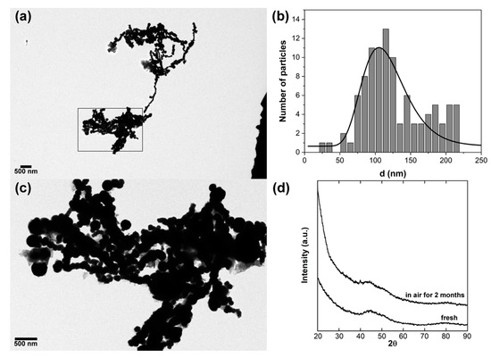 The TEM image reported in Figure 2a shows that the as-prepared sample is almost entirely constituted of chain-like clusters of interconnected spheroidal particles with a broad size distribution, ranging from 80 to 200 nm. The distribution, generated by measuring the size of more than 100 nanoparticles, was fitted by a log-normal function (Figure 2b), which is well-known to provide good fits for most of small particles distributions [27,28], and which gave a particles log-normal mean size of 114 nm. The TEM image at higher magnification (Figure 2c) shows the spheroidal shape of the iron particles and also highlights the presence of a quite limited amount of precursor residuals (sheet structures) surrounding some among the particles. Their amorphous character is evidenced by the XRD patterns of the sample (Figure 2d), where the absence of sharp peaks together with the presence of a broad halo in the low-angle range clearly indicate that the freshly synthesized particles possess a glassy structure that is still maintained after two months of air exposure. As stated in the abstract, this indicates that the particles are stable against oxidation over a long time period.