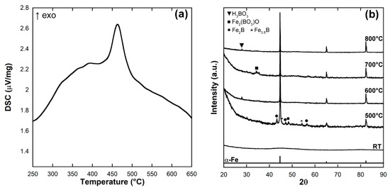 DSC analysis under Ar was performed to study the thermal behavior of the sample. Figure 3a shows an exothermic peak centered at 465 °C, due to the crystallization of the amorphous iron particles into polycrystalline α-Fe, a phenomenon that occurs in similar fashion to what was described for analogous materials in [18,19,20,21]. The structural evolution of the sample with temperature is shown in Figure 3b, where the XRD patterns of the particles treated at different temperatures under N2 inert atmosphere are reported and compared with the one of the as-prepared sample at RT. The very sharp peaks corresponding to crystalline α-Fe Powder Diffraction File (PDF) card of Fe, numbers 6–696) in the XRD pattern of the sample treated at 500 °C confirm that the crystallization of the amorphous iron particles took place below that temperature, and is in accordance to what indicated by the DSC peak. Besides, at 500 °C few minor XRD peaks with lower intensity were observed and ascribed to the formation of iron borides similarly to those observed in [21] (PDF card of Fe2B, numbers 72–1301 and of Fe3.5B, numbers 34–1032). The appearance of iron borides allows speculating on the origin of the stability of the particles over time against their possible oxidation. Indeed, such a stability could be likely ascribed to the presence of a not negligible amorphous layer constituted mainly of boron coming from the material synthesis and covering the whole particle’s surface [20,21]. Upon heating, such a layer seems to crystallize as an alloy with some iron, quite similarly to what described by Yang et al. in [21]. Besides, upon further increase of the thermal treatment temperature, the width of all XRD peaks decreases due to the increase of the size of the α-Fe crystalline domains, as also pointed out by the Scherrer equation applied to the {100} reflection, whose estimate of the mean size of the coherently diffracting domains is reported in Table 1 [26]. It should be noted that above 600 °C this calculated mean size approaches the maximum size of the particles, until exceeding it at 800 °C (Table 1). This trend, culminating with the result obtained at 800 °C, indicates that some coalescence likely occurs among them at high temperature, finally giving rise to crystal domains with a larger size than that of the biggest starting iron particles. Moreover, in the samples treated at 600, 700, and 800 °C, the iron borides’ peaks disappear and the diffraction patterns are strongly dominated by the α-Fe peaks, suggesting that, likely, these phases are poorly stable and located on the particles surface. Finally, at 600, 700, and 800 °C, very weak peaks are also present, which might be respectively attributed to iron borate oxide and boric acid [29] (PDF card of H3BO3, numbers 30–0199 and of Fe2(BO3)O, numbers 79–2433) impurities, still possibly originating from the precursors’ surficial residues crystallizing at high temperature.