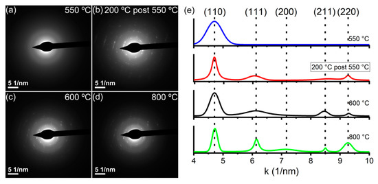 Figure 5. Selected area EDP of the same group of amorphous iron particles imaged in Figure 4: (a) EDP recorded right after the first trace of crystallization appeared, at 550 °C; (b) EDP recorded at 200 °C, a few seconds after the crystallization observed in panel (a) had started; (c) EDP recorded at a steady temperature of 600 °C, after quickly raising the temperature from 200 to 550 °C, and from 550 up to 600 °C with a rate of 10 °C min−1; (d) EDP recorded at a steady temperature of 800 °C, after a thermal increase from 600 up to 800 °C with a rate of 10 °C min−1; (e) line profiles extracted by the integration of the EDP of panels (ad) performed on the main rings containing the α-Fe ED spots. Reflections of α-Fe corresponding to the peaks are indicated by dashed lines for better clarity.