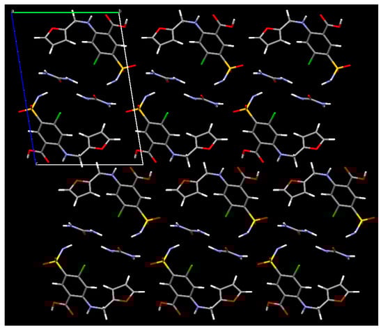 The crystal structure of FUR:URE, viewed down the a-axis. The contents of three unit cells along b and two unit cells along c are displayed, showing the layering of the urea molecules between the furosemide molecules.