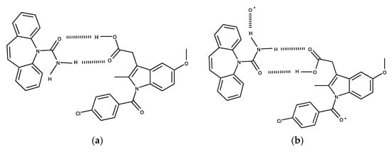 The core hydrogen bonding motifs are essentially the same in both the previously reported CBZ:IND form I [24] and CBZ:IND form II, taking the general form illustrated in Figure 3b, i.e., a central synthon and an N–H⋅⋅⋅O hydrogen bond between the amide of the CBZ and the oxygen of the 4-chlorobenzoyl group of the IND. The density of form II (1.398 g cm−3) is higher than that of form I (1.351 g cm−3), which is indicative of more efficient packing in form II. The melting point of form II (151 °C) exceeds that of form I (144 °C), and that form II is the more thermodynamically stable form has been confirmed by competitive slurry with temperature cycling [25].