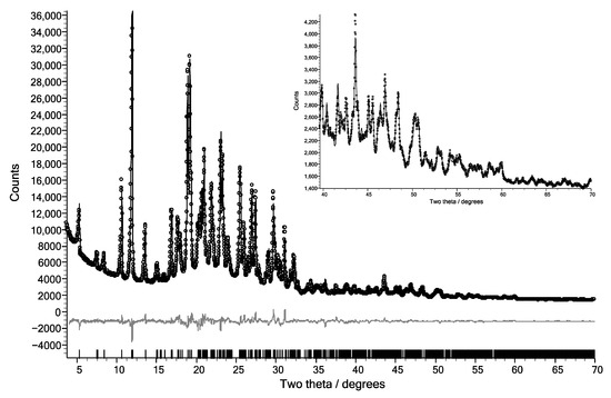 Observed (open circles) and calculated (solid black line) data for the Rietveld refined crystal structure of CBZ:IND form II. The difference plot is shown in grey, reflection positions are indicated by vertical markers on the x-axis, and the inset shows the fit to the data at a high angle.