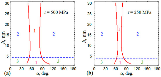 Figure 3). In region 1, the emission of lattice dislocations was more energetically favorable than the nucleation of nanocracks. At the same time, in the region 2, the generation of nanocracks was energetically favorable only (