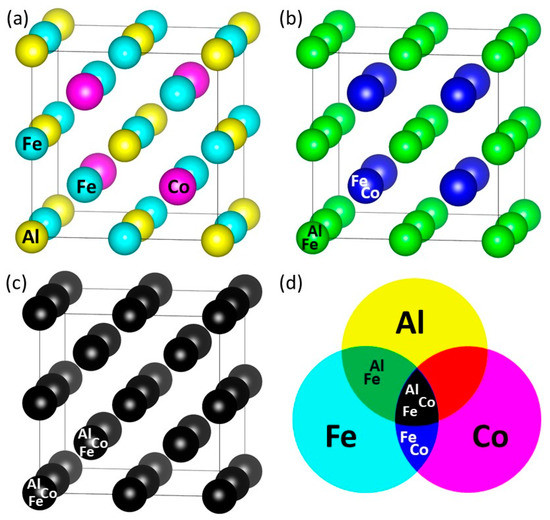 The Fe2AlCo has, under 1000 K, a two-phase superalloy nanostructure with cuboids of a partly ordered phase coherently co-existing in a differently (or less) ordered matrix. The ordered phase has not the full-Heusler lattice (the L21 structure as a ternary analogue of D03) because quantum-mechanical calculations showed that it is mechanically unstable [13] and the inverse-Heusler structure, cf., Figure 1a, is both mechanically and thermodynamically more stable [10,13]. The inverse-Heusler is also in a better agreement with experiments (see, e.g., Ref. [19]). In the high-temperature range, the arrangement of atoms may become even less ordered, exhibiting B2 and A2 lattices (Figure 1b,c).