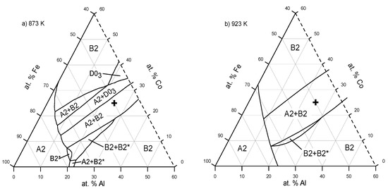 Details of the isothermal sections of the Fe–Al–Co system at (a) 873 K, calculated, and (b) 923 K, experimental, according to Kozakai et al. [20].