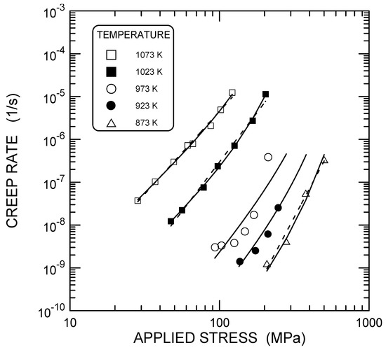 where Q is the activation energy and R is the universal gas constant. The values of parameters in Equation (3) can be found by multivariable regression of the measured data (Table 1). The analysis was performed separately for high temperatures (1023 K and 1073 K) and low temperatures (873 K, 923 K and 973 K). The resulting values are presented in ×1. It should be noted that the Garofalo equation is an empirical equation based on the evaluation of creep data of single-phase materials: (Cu, Al, Al-3Mg) and austenitic steel. However, it can also be used to describe data of multiphase materials [25]. Its use in describing rather limited present data obtained at temperatures of 923 and 973 K should be considered with caution.
