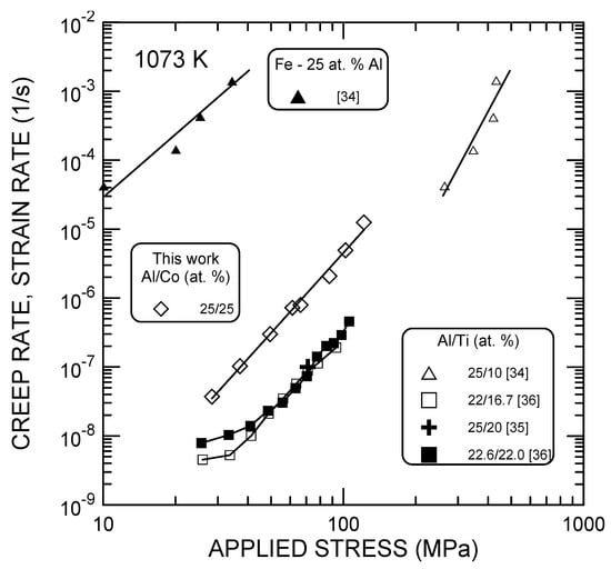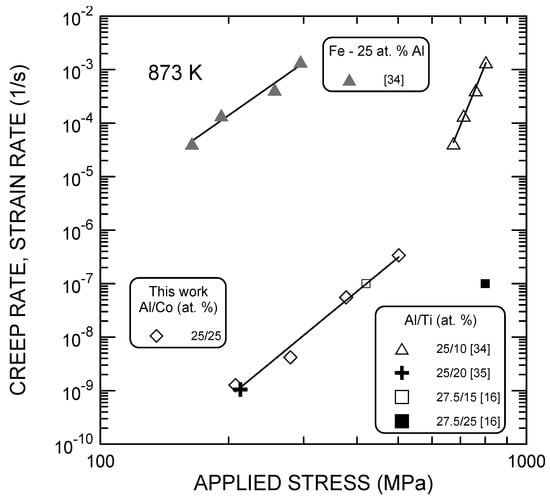 Figure 5 and Figure 6 show a comparison of the stress dependence of the creep rate in the present alloy and a binary Fe-25 at. % alloy [34] at 873 K and 1073 K, respectively. The addition of cobalt significantly improves the creep resistance, particularly at the lower temperature. The comparison is complemented by the results of creep research in ternary alloys of Fe–Al–Ti, where the Heusler phase is also formed [16,35,36]. The data used for comparison were also obtained by the compressive testing. The data point of the alloy with 25 at. % Al and 20 at. % Ti at 873 K [35] was obtained by extrapolating the data at 1073 K using the appropriate activation energy and stress exponent. Evidently, at 1073 K, the effect of titanium additions on creep is somewhat more pronounced than the effect of cobalt addition. On the other hand, at a temperature of 873 K, the effects of the addition of both elements are approximately equal. This observation may be related to the position of both elements in the periodic table.