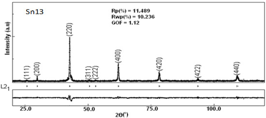 The experimental results of the XRD, DSC, and SEM measurements of Ni50Mn50−xSnx (x = 10, 11, 12 and 13) ribbons are discussed in this paper. To begin with, the martensitic or austenitic structures have been determined by X-ray diffraction. The crystal structure at room temperature is always essential to decide the thermal analysis procedure [15]. If the phase detected by XRD is cubic, then the martensitic transition (if it occurs) must be found below room temperature. However, if the detected phase is less ordered, then the inverse austenitic transformation (if it occurs) must be found by heating the sample. Figure 1 shows the room temperature XRD patterns of the samples labeled as Sn10, Sn11, and Sn12. The reflection peaks are identified to correspond to a monoclinic structure with modulation. Its structural parameters are given in Table 1. Thus, the relative peak intensities are different. The monoclinic phase is the same, 7M, in Sn10 as in Sn11 alloys. However, it is 10M in Sn12. It is known that the Heusler alloys may have anisotropy, texture, and/or modulation effects [16]. In contrast, Figure 2 gives the XRD pattern of the sample labeled as Sn13. It shows also a unique phase—in this case, an austenitic cubic phase. The detection and identification of the (111) and (311) reflection peaks confirm that the highly ordered L21 structure is obtained. The lattice parameter is a = 0.59827(5) nm (space group: Fm-3m). However, the alloy Sn13 is in the austenite phase.