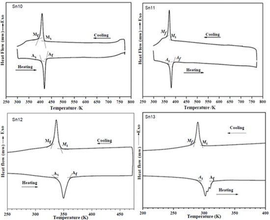 From XRD diffraction patterns analysis, it is clear that if the martensitic transformation is present in the alloy, the DSC scans of Sn10, Sn11, and Sn12 ribbons should be performed by a heating/cooling cycle from room temperature. Likewise, the DSC scan of alloy Sn13 should be performed by a cooling/heating cycle, also from room temperature. As shown in Figure 4, the DSC scans show a well-defined peak (the exception is alloy Sn13 on heating showing small humps, which were probably due to a local inhomogeneous composition). Rekik et al. [18] and Zeng et al. [19] have found similar results. In fact, DSC curves allow all the characteristic first-order transformation temperatures: austenite to austenite (on cooling) start and finish (Ms and Mf), and the reversible martensite to austenite (on heating) start and finish (As and Af). Values are given in Table 2. The beginning and the end of the transformation of the temperatures have been determined by the procedure described in ref. [18]. Likewise, it is known that the characteristic temperatures have been reported to depend on outer electron concentration [20]. Another thermal parameter is the width of the hysteresis, ΔT (ΔT = As−Mf). In this work, the values of this parameter range between 5 and 13 K. Furthermore, the thermal hysteresis range is increased upon increasing the elastic and surface energies [15]. Consequently, the nucleation of the martensitic phase implies super cooling.