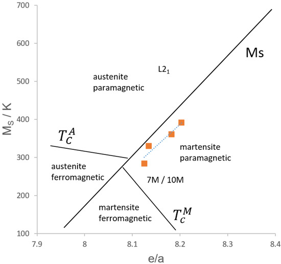 Thus, by compositional (and e/a) accurate selection, it is possible to design an alloy with a desired working temperature range. Nevertheless, the functional properties (magnetocaloric effect, magnetoresistance, exchange bias, magnetic field-induced strain) do not depend only on e/a. There are other parameters linked to functional response: magnetic interactions between atoms, the concurrence of the structural and Curie ferromagnetic transformation, and so on. Likewise, characteristic temperatures also depend on the production techniques, processing conditions, and ulterior annealing. For it, different temperatures values and ranges can be found in the literature for alloys with composition close to those of this study [28]. In references [22,29], the temperatures are lower/higher for Sn13 and Sn10 alloys, respectively. It is known that the shape, geometry, and processing parameter (as the wheel speed) influence the characteristic temperatures [17,30]. For it, it is recommended to compare alloys produced at the same conditions or to be careful in the comparative analysis. Figure 5 shows a phase diagram of the martensite start temperature versus e/a. The comparison is performed with data obtained in bulk alloys [27]. Our values are lower due to the lower dimensionality of the samples. Nevertheless, the linear trend corroborates the option to produce alloys with the thermal hysteresis interval at the desired temperature range. Likewise, the crystallographic phases detected at room temperature are in good agreement with those expected.
