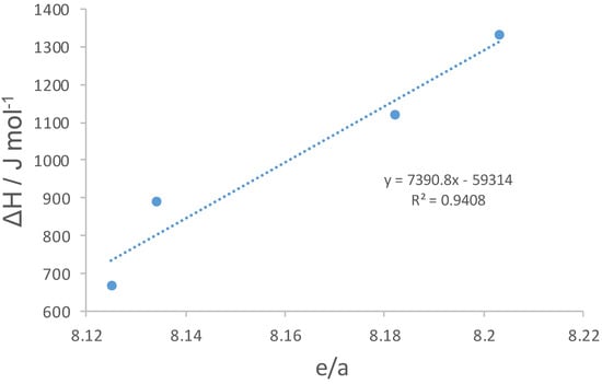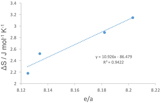 The enthalpy and entropy structural changes (∆H and ∆S, respectively) are calculated from calorimetry data [11]. The calculated values for structural ∆H and ∆S are shown in Table 2. The linear tendency of both parameters as a function of e/a is confirmed by linear fitting (Figure 6 and Figure 7), where the values are the average of cooling (c) and heating (h) of Table 2.