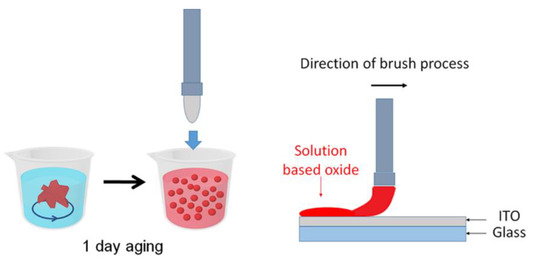 In addition, the solution coating process is also an important technique for enhancing the performance of functional devices, because it is directly connected to the quality of the film, such as orientation and crystallization, which affects the performance of the devices. [10,11]. Various solution processes, including spin-coating [12], dip-coating [13], blade coating [14], and brush-coating [15,16], have been developed for advanced performance of the devices. For example, the desirable performance of optics and electronics devices can be achieved by producing high-quality polymer films or quantum dot deposition by adopting various solution coating techniques [17,18,19]. Among the several solution coating techniques, brush-coating allows controllable liquid transfer by shearing the solution and successfully orienting the materials, which can obtain a higher performance of opto-electrical devices [15,16]. Therefore, the brush-coating can be useful when the materials require an oriented nano/microstructure.