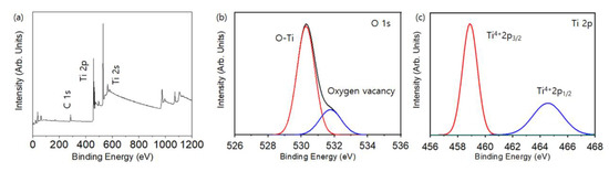 (a) Wide scan image, (b) O 1s and (c) Ti 2p core level X-ray photoelectron spectroscopy spectra of brush-coated TiO2.