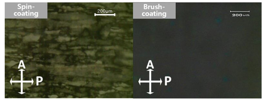 Liquid crystal (LC)-based devices are very suitable for adopting brush-coatings because they require an oriented structure. LC devices can be successfully operated under the condition of uniform LC alignment, which is the core technology for uniform and high quality electro-optical performance [20]. Various alignment techniques, including the rubbing process [21], ultraviolet photo-alignment technique [22], nanoimprint lithography [23], and ion beam irradiation [24], have been developed for uniform LC alignment. Although these methods have several advantages, such as high quality and desirable performance, these techniques suffer from limitations, such as the generation of contaminant debris and the limitation of a large-area process with high cost. Thus, a need to develop alignment technique for advanced LC devices arises.