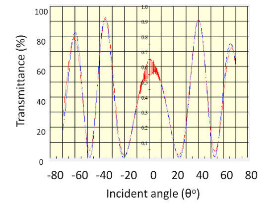 Transmittance versus incident angle for the LC cell based on the brush-coated TiO2 measured by crystal rotation method.