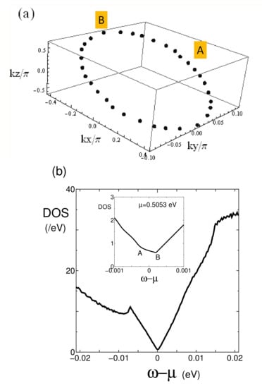 Figure 2a shows a nodal line, a loop of Dirac point , which is obtained from Equation (5). The Dirac point is symmetric with respect to the point, . There is a mirror symmetry with respect to , which gives two typical Dirac points given by (0, 0.096, 0) (A), and (−0.42, 0, 0.64) (B). The energy increases from 0.5052 to 0.5056 as the Dirac point moves from (A) to (B) and the chemical potential = 0.5053 is found on the line between (A) and (B) suggesting the nodal line semi-metal close to a zero-gap state.