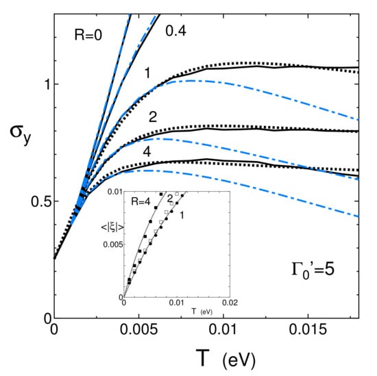 Now we examine using Equation (17) as a fitting line. Figure 4 shows T dependence of (solid line) for = 5 with the fixed R= 0, 0.4, 1, 2, and 4 (solid line). It is found that is reduced and takes a maximum in the presence of R, while with R = 0 increases monotonously. It is the main purpose of the present work to demonstrate that for R = 1 and 2 exhibit almost T independent behavior in a wide temperature region of . This exotic T dependence exists for some choices of and R, as shown later. From the dot line corresponding to Equation (17), we obtain = 0.0055, a = 0.25, and = (0.5,0.22), (1.39,0.6), and (2.6,0.81) for R = 1, 2, and 4 respectively. It is verified that b increases and decreases with increasing R. Note that the almost temperature indepednent comes from the existence of the c term, which weakens the effect of the b term. This corresponds to the suppression of as shown in the inset. In Figure 4, with the fixed is also shown by the dot-dashed line. At high temperatures, is reduced noticeably due to the deviation of from the energy of the Dirac point. For the solid line, the T dependence of in Equation (13a) is small due to , which comes from the electron-hole excitation in the conductivity. However, for the dot-dashed line, becomes large due to the fixed , resulting in the large suppression of , where the maximum is broadened. With increasing R, corresponding to a maximum of decreases, while the reduction at high temperatures is almost parallel. The inset denotes obtained from Equation (17), for R = 0.5, 1, and 2, where the symbols are fitted by the dot lines given by with for R = 4 (1), which corresponds well to that of the fitting of .