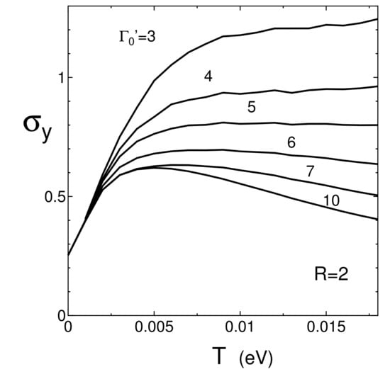 Figure 6 shows for some choices of with the fixed R = 2, where the lines with = 3 and 5 are the same as those in Figure 4 and Figure 5. With increasing R, the T dependence changes from the monotonous increase to the constant behavior and a maximum is followed for . This suggests the constant behavior is obtained for the moderate strength of in contrast to Figure 4 and Figure 5, which are examined for the fixed . The fitting by Equation (17) is also valid, since = 3 and 5 are already shown in Figure 4 and Figure 5. The line with = 10 shows a noticeable decrease of suggesting the dominant effect by the large e–p scattering at high temperatures. From Equation (17), it turns out that b suppresses but c enhances . The role of c is crucial to obtain the almost constant conductivity, since a relation at high T gives almost T independent in Equation (17). We found the almost T independent . for = (4, 0.8), (4, 1.2), (4, 2). (5, 0.5), (5, 1), (5, 2), (6, 1), (6, 1.2), and (6, 2). It turns out that the almost T independent in the interval region of is realized for and .