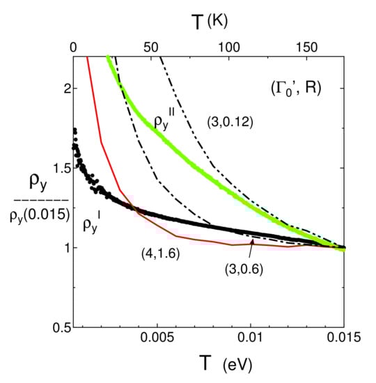 Finally, in Figure 7, we compare the present theoretical results with those of the experiment [,]. The conductivity of a single crystal under quasi hydrostatic pressure was measured by the four-probe method using the DAC (Diamond Anvil Cell) technique. For the convenience of comparison, we show the resistivity . Since the comparison of the absolute value is complicated both theoretically and experimentally, we use a simple method that the quantity is normalized at a temperature of T = 0.015. In Figure 7, the experimental result is shown by and corresponding to P = 12.6 GPa, and P = 13 GPa, respectively, which increase about 1.8 and 3.4 (0.015), respectively, with decreasing temperature. The results of the present calculation are shown for = (4,1.6), (3,0.6), and (3,0.12). The line of (3,0.6) reproduces well for , and the line of (4,1.6) shows almost constant resistivity for . The rapid increase of is compared with that of (3,0.12) for , where the weaker e–p coupling is taken. Such behavior could be expected for higher pressures due to the increase of the velocity. The larger damping (not shown in the Figure) gives a minimum for a moderate choice of R with increasing T. Such a minimum, which could be relevant to that of -(BEDT-TTF)I [] is obtained for a slightly large .
