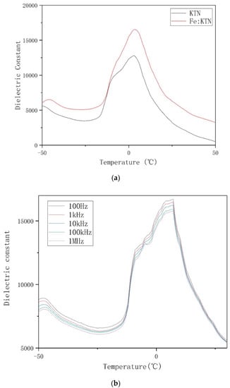 Figure 2 shows the relative permittivity εr of pure KTN and Fe: KTN crystals with the same ratio as Ta and Nb, as a function of temperature. We also measured the temperature dependence on the dielectric constant of Fe: KTN crystals at different frequencies. Fe ion doping can significantly improve the relative permittivity εr of cubic KTN crystals. Starting from −50 °C, the relative permittivity εr of Fe: KTN crystals gradually increases with the increase in temperature, reaching a maximum value of about 16,700 at the Curie temperature (TC = 4 °C). The value of Nb/(Nb+Ta) can be obtained by the following empirical equation.