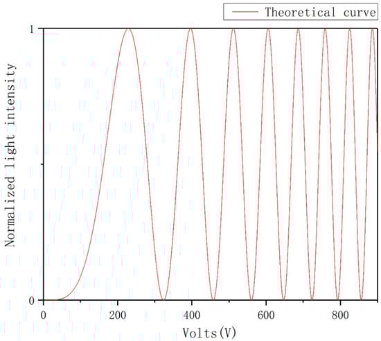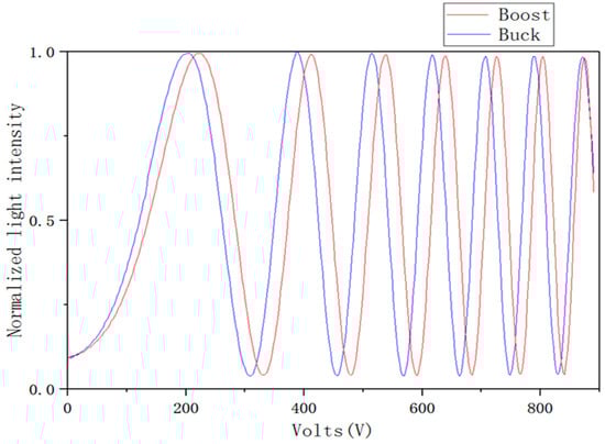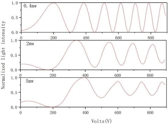 We put the effective electro-optic coefficient into Equation (3) to simplify the relationship between light intensity and voltage. Then, we used V as the abscissa and normalized I as the ordinate to make Figure 3. It can be seen that the half-wave voltage gets lower and lower, which should be caused by V2 in Equation (3); this shows that the quadratic electro-optic effect does play a major role at this time.