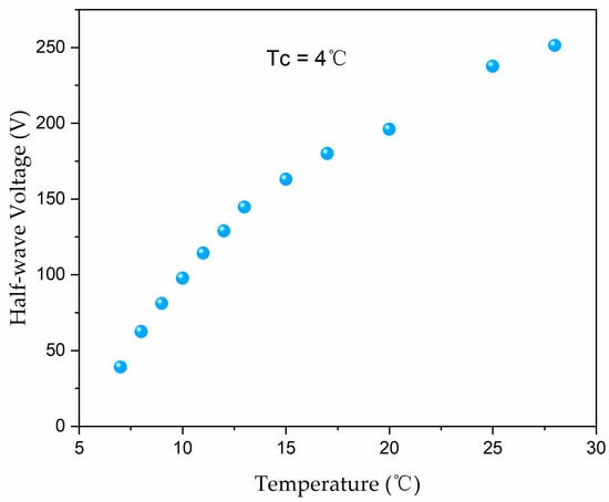 The Curie temperature of the crystal is 4 °C, and the temperature of the buck-boost experiment on the crystal is 17 °C, far from the Curie point. As we all know, when the temperature is in the range above the Curie point, the electro-optic coefficient is the largest at this time, and the electro-optic effect will be significantly enhanced. Therefore, we can predict that, when closer to the Curie point, the half-wave voltage of the crystal electro-optic modulation will drop significantly. We used TEC equipment to measure the half-wave voltage changes in crystals at different temperatures. As shown in Figure 6, the half-wave voltage of the crystal near the Curie point can be reduced to 39 V.