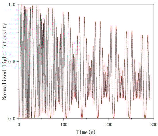 Figure 5 shows changes in the intensity of the output light under applied voltage. The first maximal output light modulation is reached at 221 V. With a local minimum around 332 V, the phase shift is 2π. The second local maximum is around 415 V, and the phase shift reaches 3π. The value of the half-wave voltage () is 221 V at 17 °C. The amplitude of the light intensity maintains good stability with slow attenuation. Compared to the theoretical curve in Figure 3, the experimental results are basically consistent with the theory, which verifies the accuracy of this experiment.