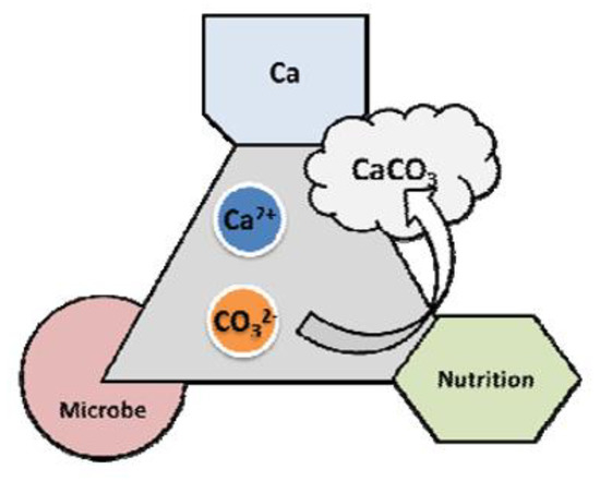 The microbial metabolic process of the bio-material mixture promotes calcium carbonate precipitation, as shown in Figure 1. It is important to manage the pH levels of the mixtures to facilitate the calcium carbonate precipitation to support the reaction.