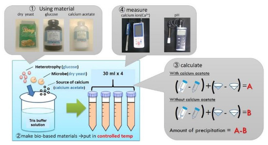 - Putri, P.Y.; Kawaai, K.; Ujike, I.; Yamamoto, S. Effect of Temperature on Precipitation Rate of Calcium Carbonate Produced through Microbial Metabolic Process of Bio Materials. Civ. Eng. Dimens. 2016, 18, 103–108. [Google Scholar] [CrossRef][Green Version]