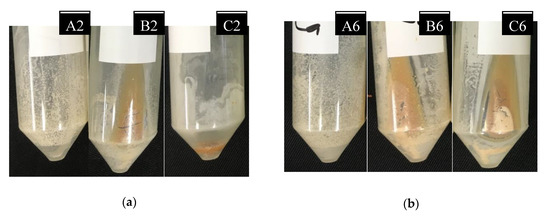 (a) Precipitates after 24 h for mixtures A2, B2, and C2; (b) precipitates after 72 h for mixtures A6, B6, and C6.
