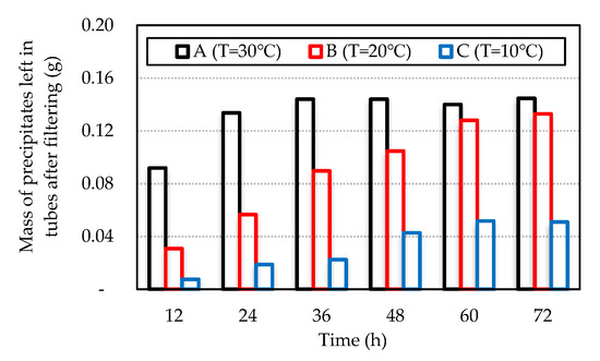 The effect of temperature was examined with respect to the precipitation rate up to 72 h after mixing. Figure 3a shows the precipitates remaining in the tubes after up to 24 h post-filtering.