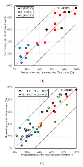The results were confirmed by the calcium ion measurement in the tested mixtures. The relationship between the decreasing rate of calcium ion and the precipitation rate through filter paper at constant temperature is shown in Figure 5a. The decreasing rate of the calcium ions was measured using the initial concentration of calcium ions (C0), and the concentration of calcium ions was measured (Ca) based on Equation (4). The average difference between the decreasing rate of calcium ions measured and the precipitation rate calculated by the filtered paper was less than 30%. The results confirmed that the decreasing rate of calcium ions was similar to the precipitation rate recorded by measuring the filter paper. The maximum precipitation of calcium carbonate was reached at 30 °C. At 30 °C, after 24 h of elapsed time, the concentration of calcium ions decreased by more than 90%, while the pH gradually lowered below 7.0.