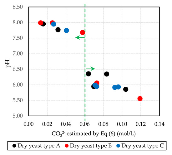 Figure 6 shows the relationship between the carbonate ions estimated by Equation (6) projected for all types of dry yeast and the changes in the pH measured in the mixture tested. Based on the graph above, two groups were confirmed. When the concentration of carbonate ion was lower than 0.06 mol/L, the pH remained higher than 7.5. When the concentration of the carbonate ion was 0.06 mol/L or more, the pH declined to a maximum of 6.50; the calcium carbonate concentration increased with the decreasing pH. The precipitation of calcium carbonate in the threefold basic composition mixture using dry yeast type B was the largest. However, regardless of the type of dry yeast, the relationship between pH and the concentration of carbonate ions was linear. From this research, adjusting the concentration of the Tris buffer solution in the mixtures using dry yeast type A or C suggested the precipitation of calcium carbonate will increase.