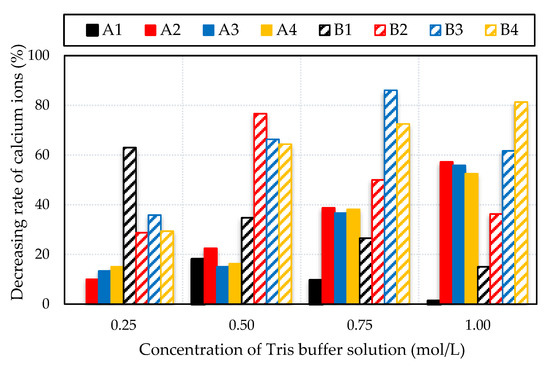 The results suggested that the faster generation of carbonate ions was due to the use of a low concentration of the mixture, which increased the precipitation of CaCO3. Otherwise, the decreasing rate of calcium ions seemed to be larger when the solution was controlled to a concentration of 0.5 mol/L, in B2, B3, and B4 mixtures. The decrease rates of the calcium ions for the B2, B3, and B4 mixtures were above 60% and their pH after 24 h were 8.09, 6.30, and 6.14, respectively. A similar tendency of the decreasing rate of calcium ions with the precipitation process was found for B3 and B4 mixed in the Tris buffer solution concentrations of 0.75 and 1.0 mol/L, respectively. The results suggested that the use of a higher concentration of basic constituent mixtures produced more calcium carbonate precipitation.